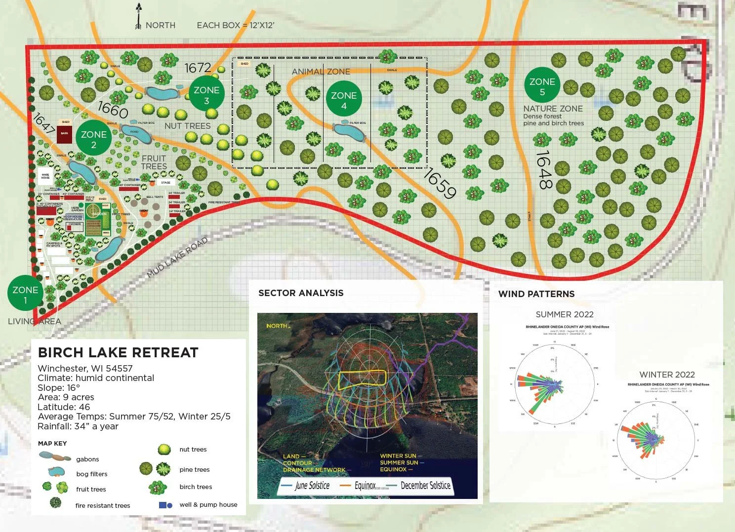 Northern Wisconsin is rich with challenges and opportunities: cold winters, sandy soils in areas, intense seasons, abundant wildlife, and enough rain to make water management worth planning from day one. For my final assignment, I designed a long-term plan for the land that works with the ecosystem rather than against it.
