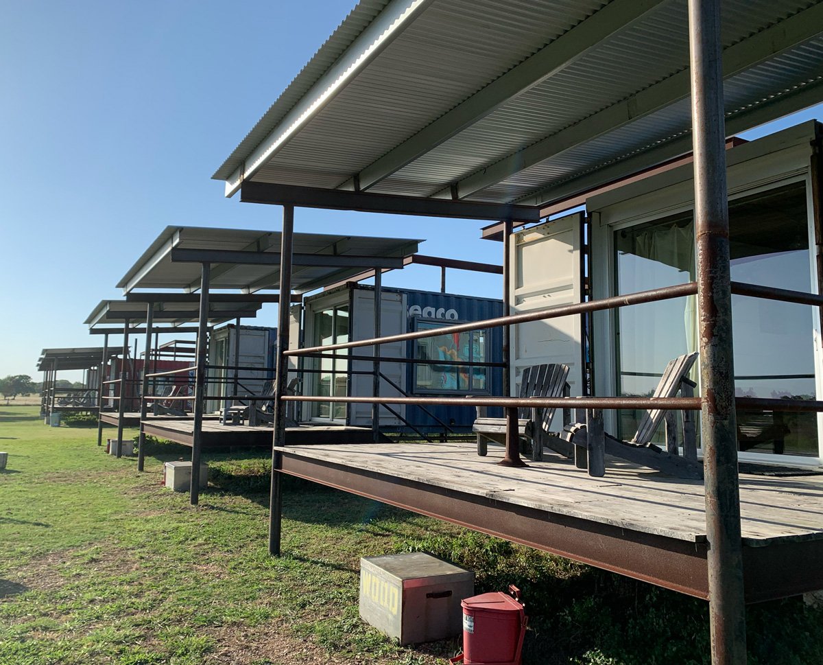 Their uniquely designed interiors are cladded with sustainably harvested barn wood, the windows were salvaged from a school, the cabinets from an old lab, and the counter tops are old bowling alley floors! Round Top appears [to me] to be the funky antique capital of the world so the vintage artifacts throughout the containers were found around town or at their own Recycling the Past business on the property.